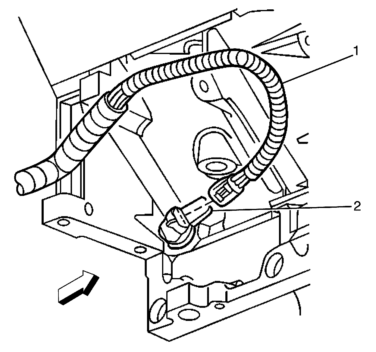 4. Disconnect the crankshaft position (CKP) sensor electrical connector (2) from the wiring harness (1).