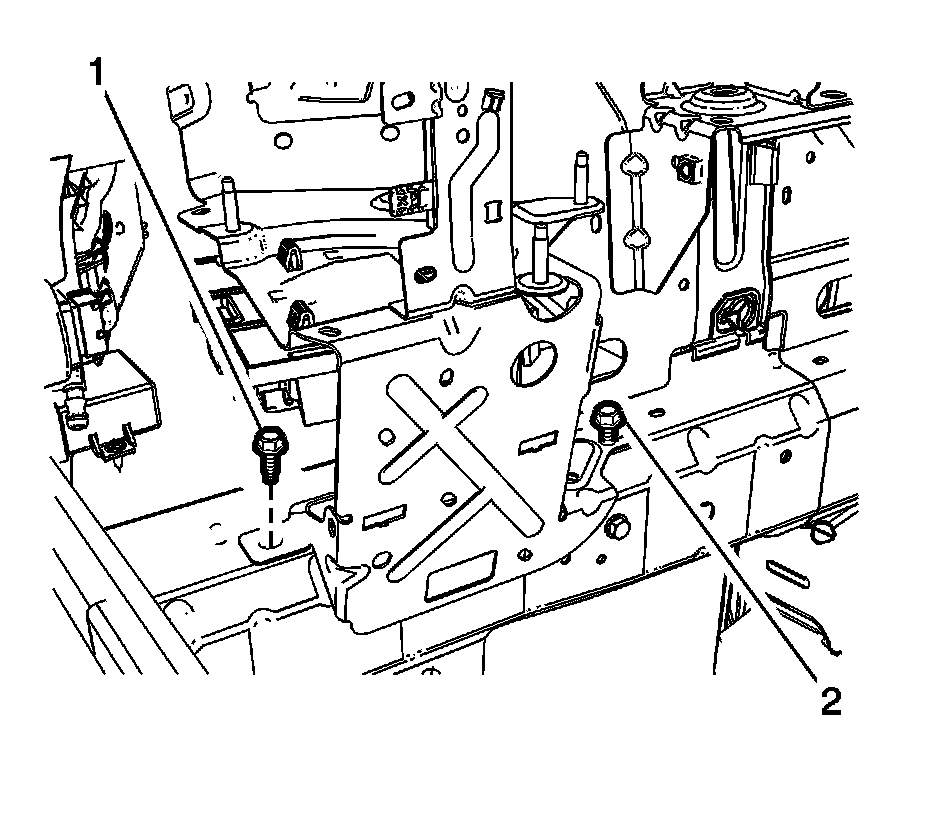 6. Remove the ECM bracket fastener (1) and partially loosen the rear ECM bracket fastener (2).