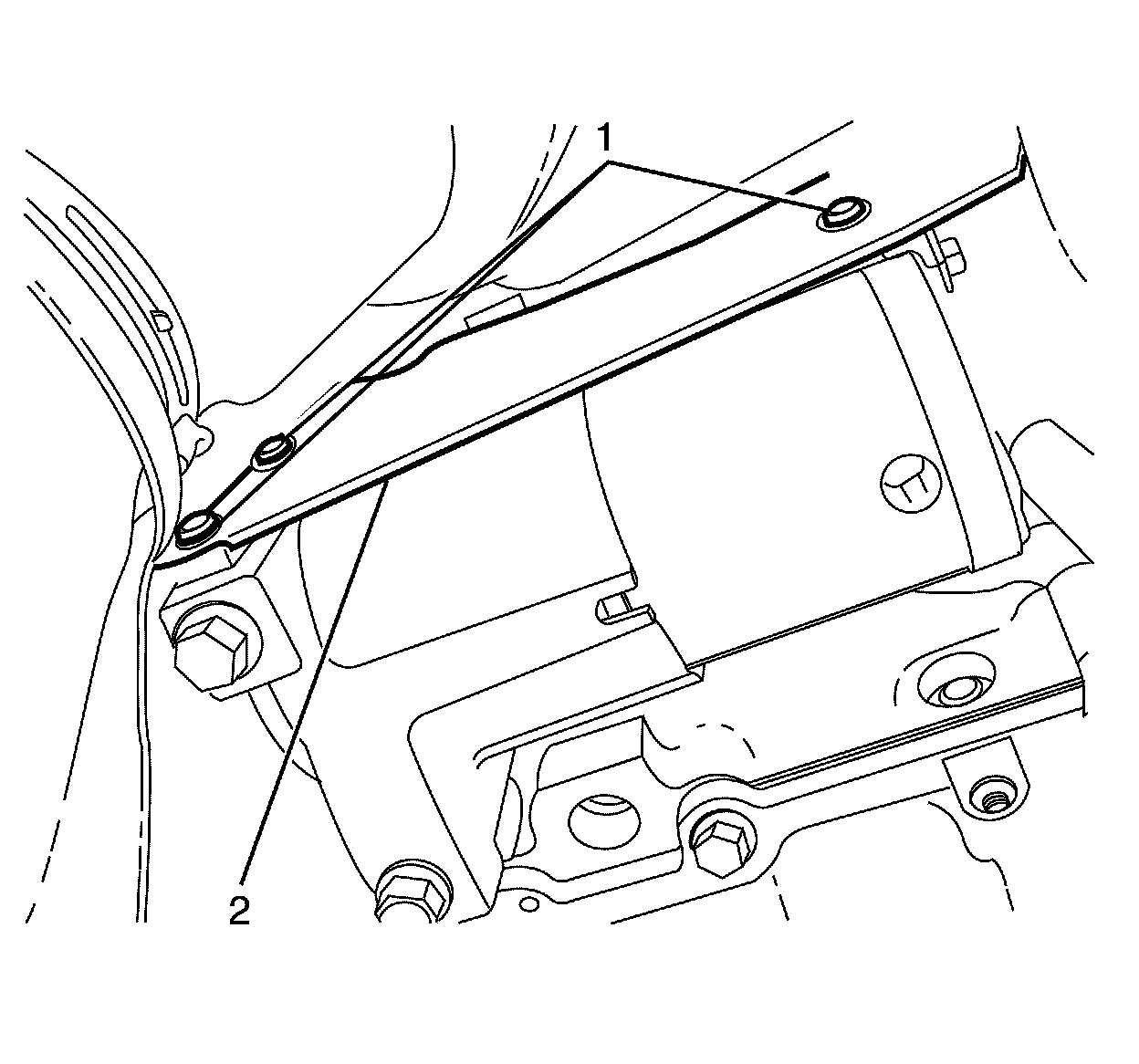 4. Remove the starter motor heat shield to starter motor retaining bolts (1).