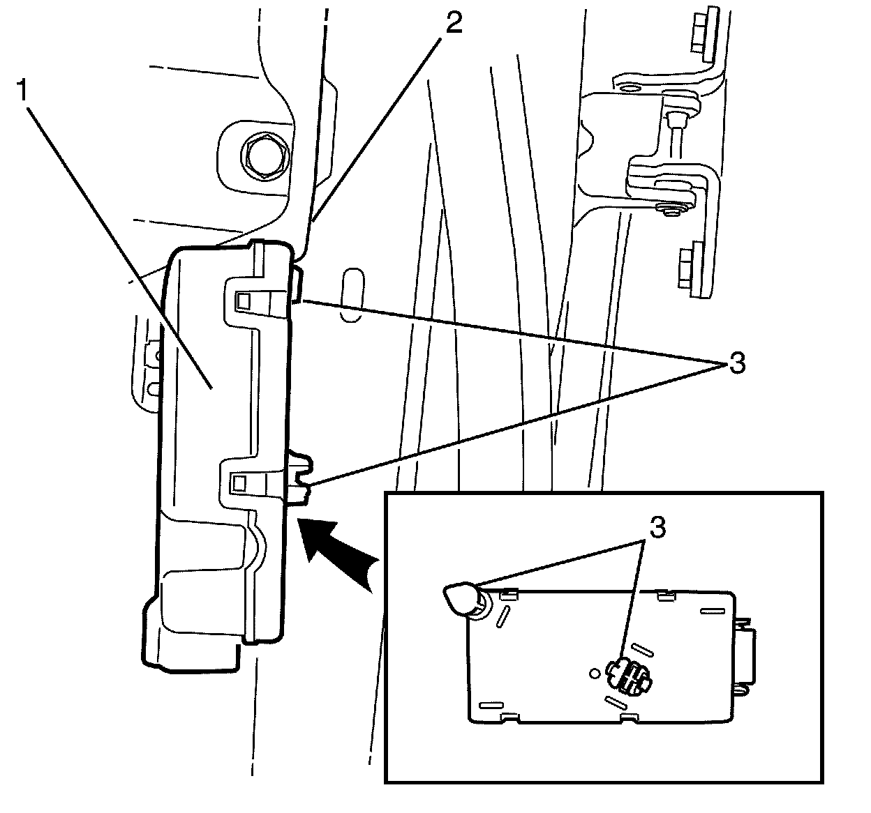 6. Pry the door module (1) with a suitable flat bladed tool to release the retainers (3).