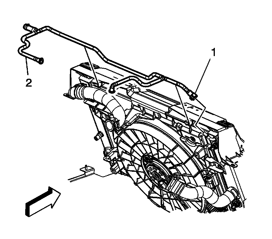 8. Vehicle equipped with a transmission oil cooler, connect the upper transmission oil cooler line to the radiator. Refer to Transmission Fluid Cooler Hose/Pipe Quick-Connect Fitting Disconnection and Connection Transmission Fluid Cooler Hose/Pipe Quick-Connect Fitting Disconnection and Connection.