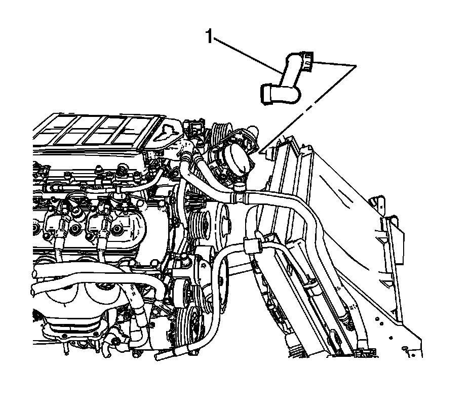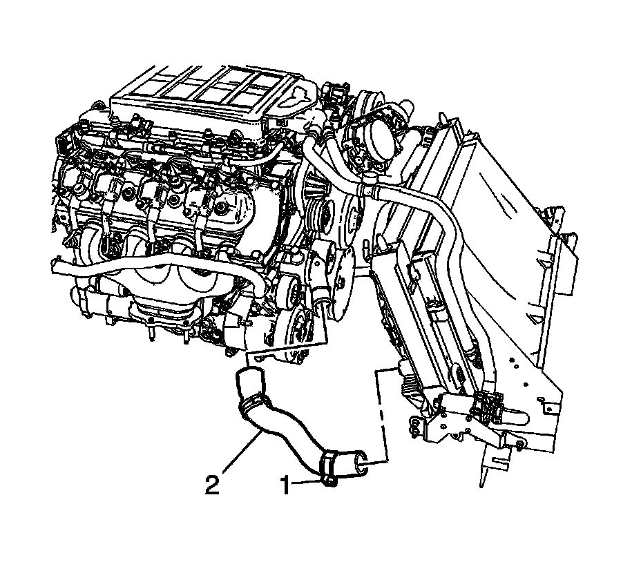 12. Disengage tension on the radiator outlet hose clamp (1) at the radiator using the J 38185 - Hose Clamp Pliers.