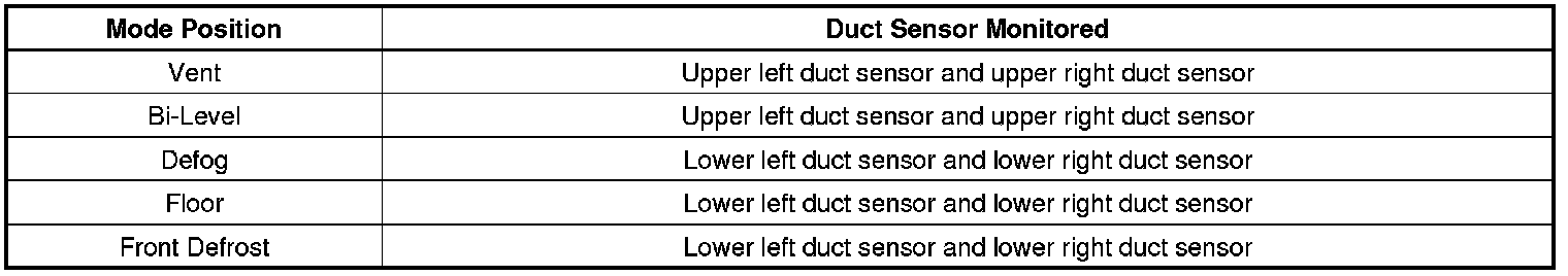 The upper and lower duct sensors are divided into left and right zone operation. The left side upper and lower duct sensors will only effect the operation of the left air temperature actuator and the right side upper and lower duct sensors will only effect the operation of the right air temperature actuator. The duct sensors are used to measure the temperature of the air exiting the ducts. The sensors operate within a temperature range between -6.5°C (20.3°F) to 57.5°C (135.5°F). When temperature increases the sensor signal decreases. The HVAC control module converts the 0-5 volt sensor signal to a range between 0-255 counts. If the HVAC control module detects that one of the duct temperatures must change, the HVAC control module will adjust the appropriate air temperature actuator. The following list shows the duct sensors that are monitored by the HVAC control module in each mode position: