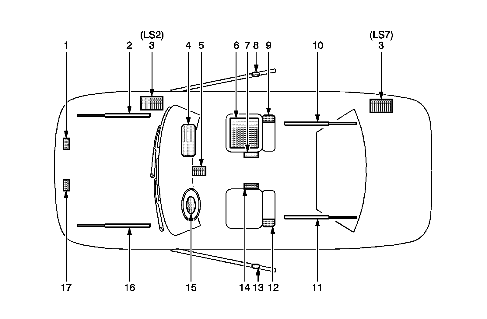 3 - Vehicle Battery-Located under the hood on the right side (LS2), in the trunk on the right side (LS7)