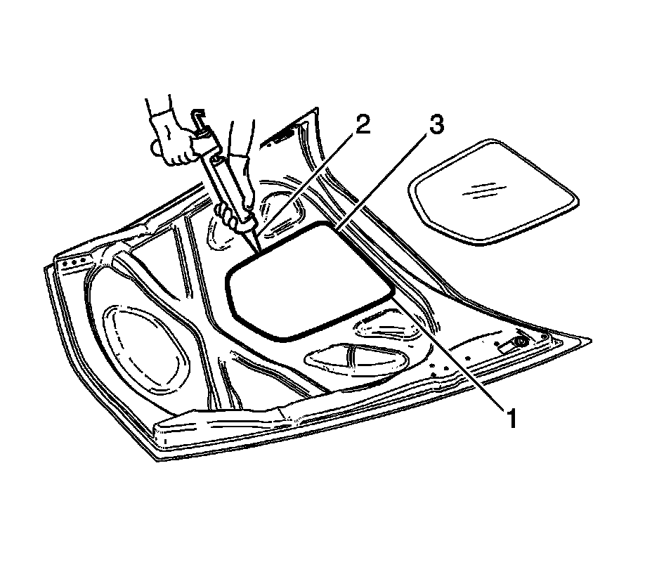 11. Use the seal (1) as a guide to apply the urethane adhesive (2) to the inner surface of the hood (3).