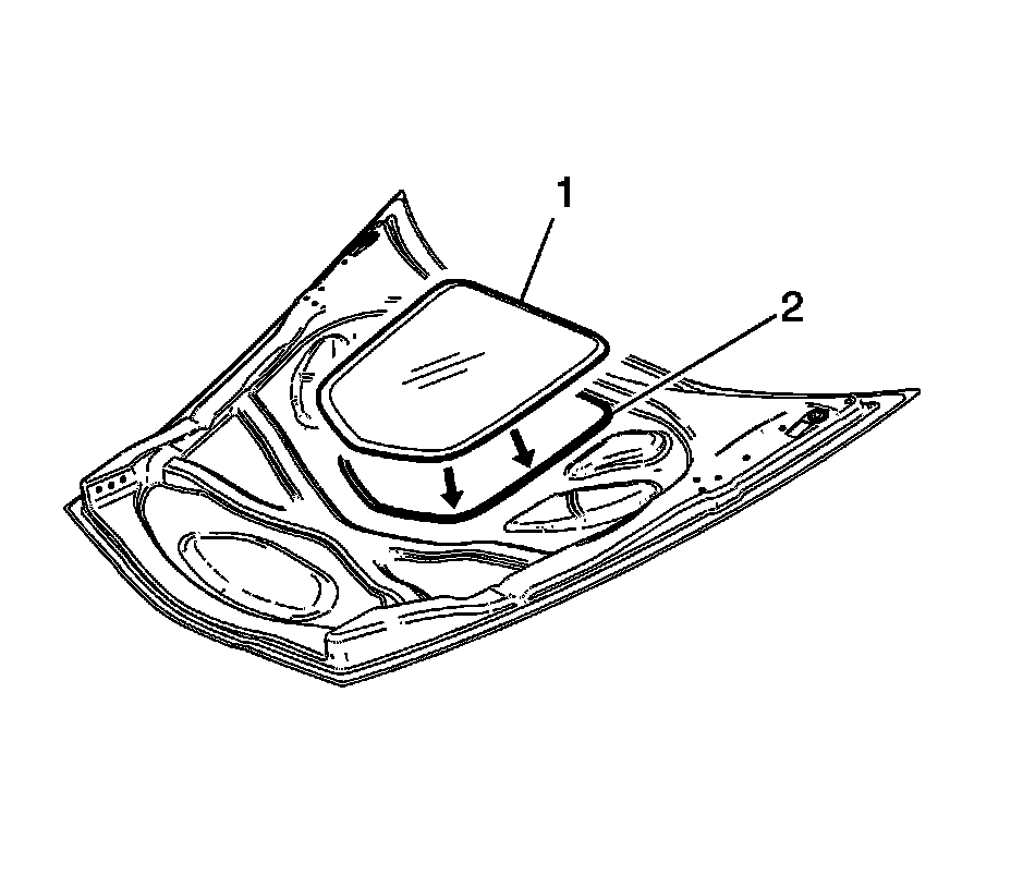 12. Install the hood window (1) into the opening (2).