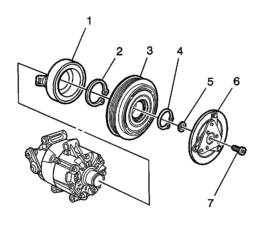6. Remove the pulley and bearing assembly (3) from the A/C compressor.