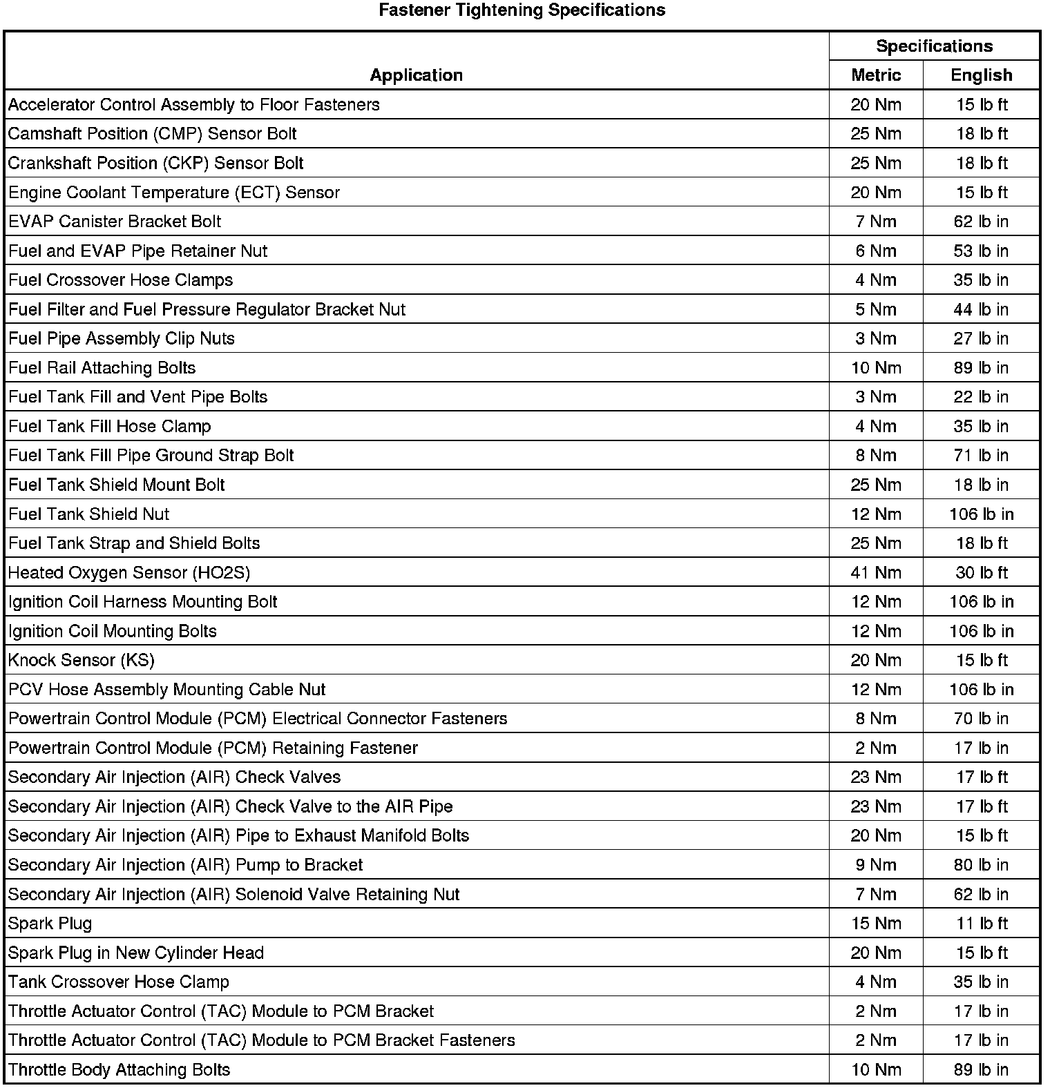 Fastener Tightening Specifications