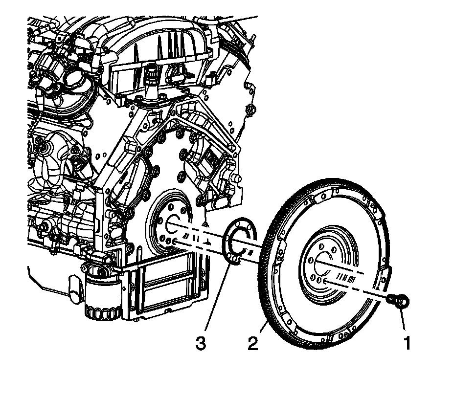 * For manual transmission applications, note the position and direction of the engine flywheel before removal. The flywheel does not use a locating pin for alignment. Mark or scribe the end of the crankshaft and the flywheel before component removal. The engine flywheel must be reinstalled to the original position and direction. The engine flywheel will not initially seat against the crankshaft flange, but will be pulled onto the crankshaft by the engine flywheel bolts. This procedure requires a 3 stage tightening process.