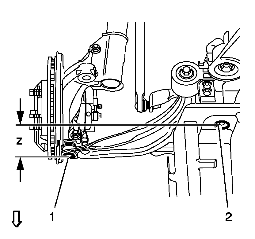 The Z Height: The vertical distance from the cradle side rail bottom surface (2) accessed through hole in the engine shield to the center of the ball joint cup (1).
