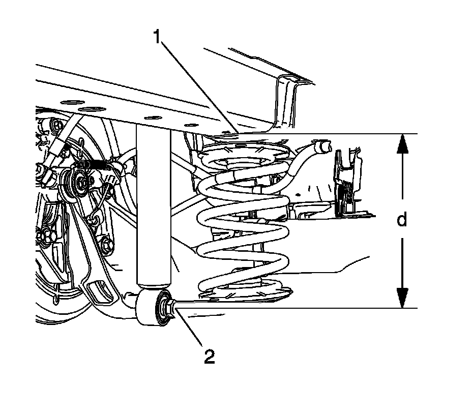 The D Height: The vertical distance from the bottom surface of the body side rail (1) to the center of the lower shock attaching bolt head (2).