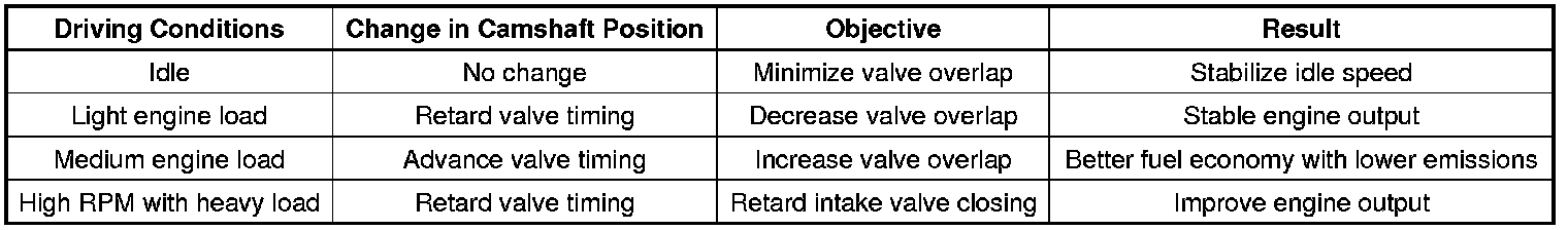 The ECM can also command the camshaft position actuator solenoid valve - Intake and camshaft position actuator solenoid valve - exhaust to stop oil flow from both passages in order to hold the current camshaft position. The ECM is continuously comparing camshaft position sensor - intake and camshaft position sensor - exhaust input with camshaft position actuator solenoid valve - Intake and camshaft position actuator solenoid valve - exhaust input in order to monitor camshaft position and detect any system malfunctions. The following table provides camshaft phase commands for common driving conditions: