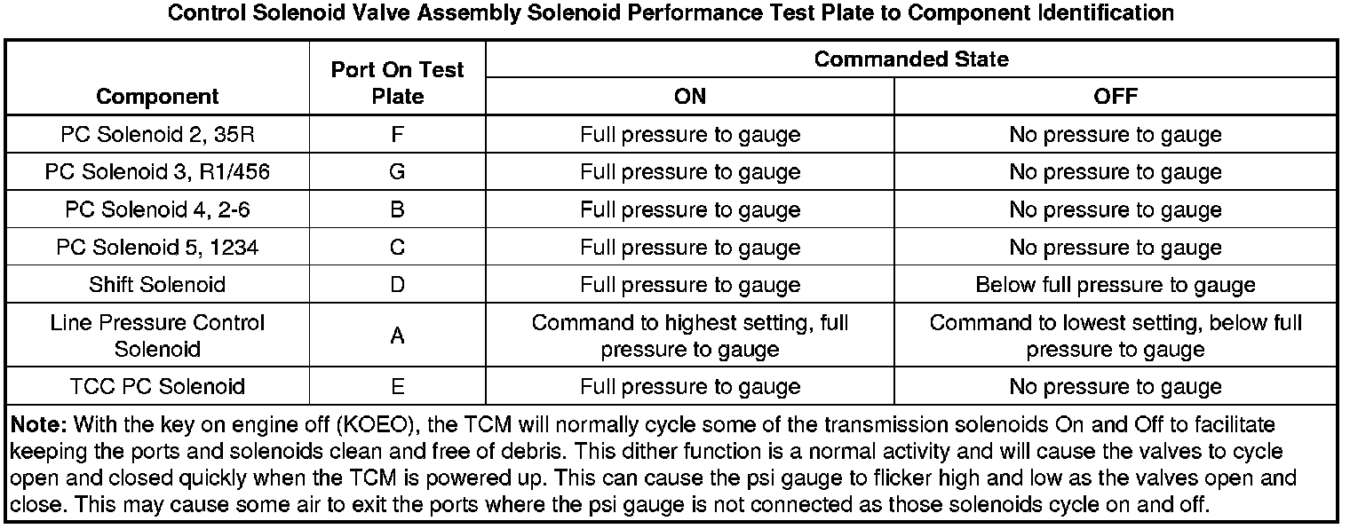 The purpose of this procedure is to test the functionality of the control solenoid valve assembly solenoids for a gross stuck open or stuck closed condition. DT-48616 - test plate is bolted to the control solenoid valve assembly on the valve body mounting surface. Pressurized air is passed into the aluminum test block, through the control solenoid valve assembly solenoid passage and back to a pressure gauge on the test block. The pressure gauge indicates open if air pressure is passed through the solenoid, or closed if the solenoid is unable to pass air through. A scan tool is used to command the solenoids ON and OFF. While watching the pressure gauge, one can determine the valve functionality. The recommended shop air pressure for this test is 90-100 psi.