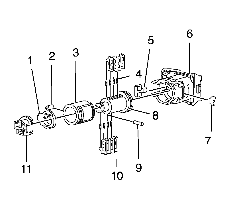 Note: The tumblers (5) are not self-retaining and must be held in place if the key is not fully inserted into the lock cylinder or until the cylinder (2) is assembled into the case assembly (8).