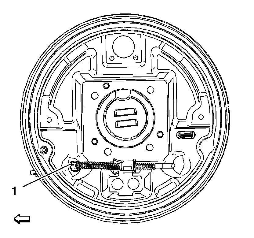 6. Release the rear park brake cable end fitting (1) from the drum brake backing plate.