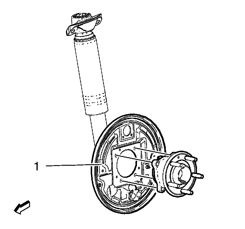 7. Remove the wheel bearing/hub assembly. Refer to Rear Wheel Bearing and Hub Replacement (Drum Brake) Rear SuspensionRear Wheel Bearing and Hub Replacement (Disc Brakes) Rear Wheel Bearing and Hub Replacement (Disc Brakes)