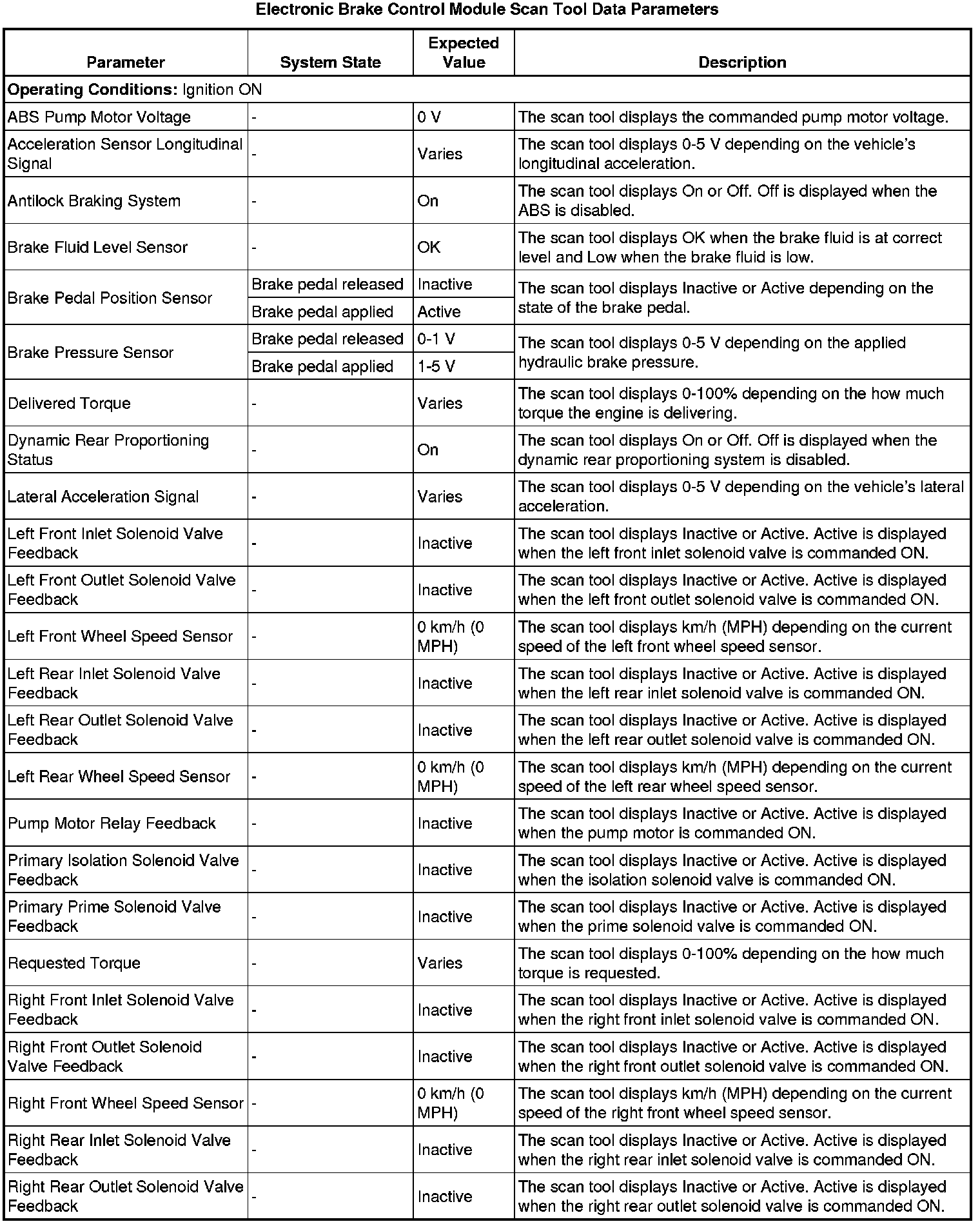 The electronic brake control module (EBCM) scan tool data parameters list contains all ABS related parameters that are available on the scan tool. The list is arranged in alphabetical order. A given parameter may appear in any one of the data lists.
