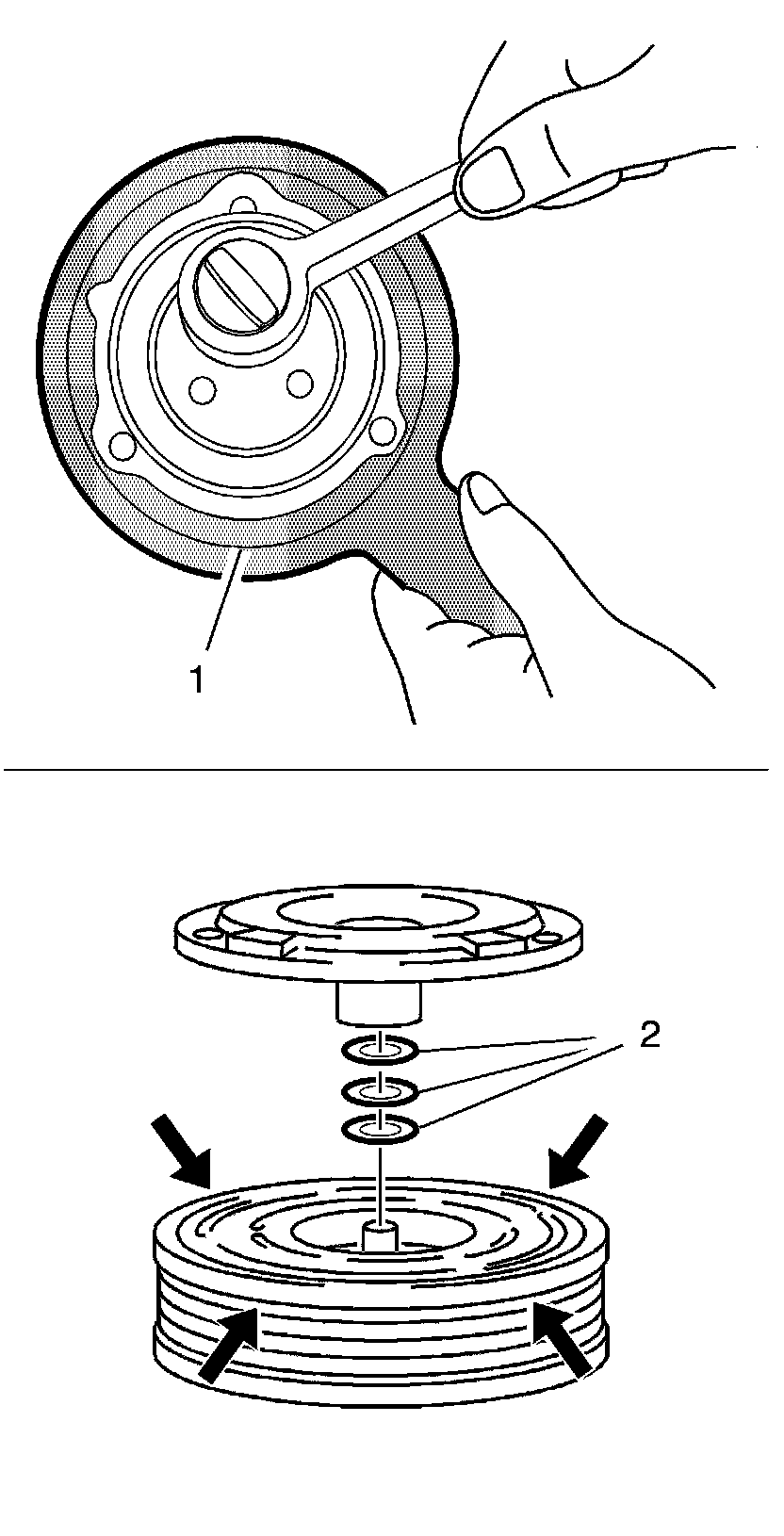 1. Remove the A/C compressor. Refer to Air Conditioning Compressor Replacement (LUJ) Air Conditioning Compressor ReplacementAir Conditioning Compressor Replacement (1.8L LUW) Air Conditioning Compressor Replacement.