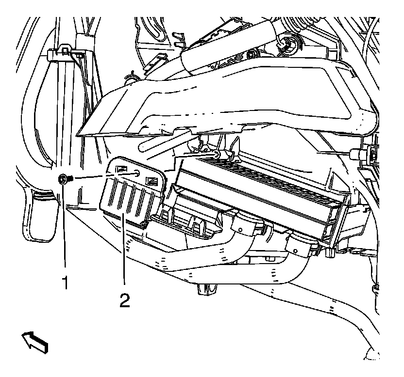 4. Install the heater core cover bolt (1) and heater core cover (2).