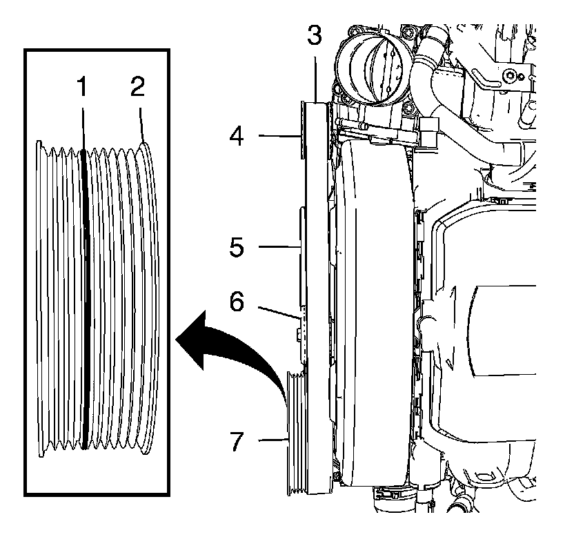 Note: Make sure that the drive belt is aligned on the generator pulley (4), crankshaft balancer (5), drive belt tensioner (6) and water pump pulley (7). The drive belt must lie on the water pump pulley between the flange (1) and (2).