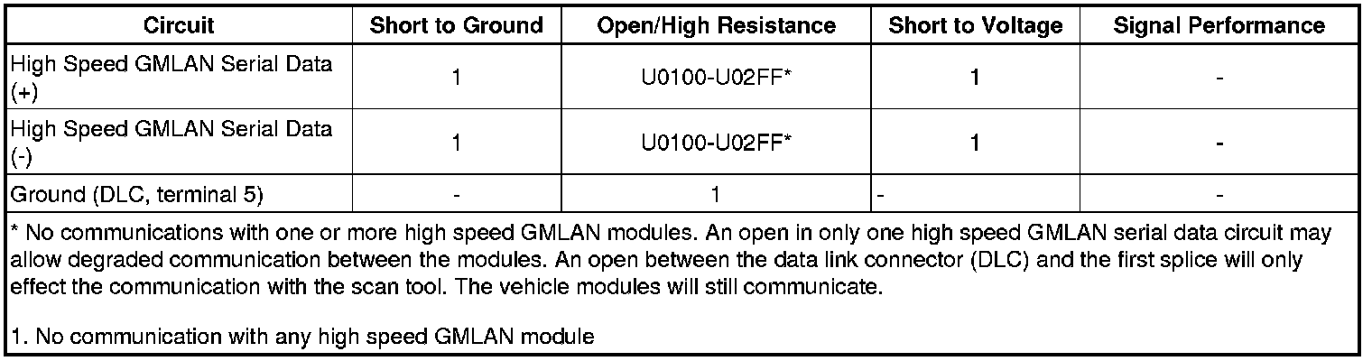 * Communication may be available between the body control module (BCM) and the scan tool with the high speed GMLAN serial data system inoperative. This condition is due to the BCM using both the high and low speed GMLAN systems.