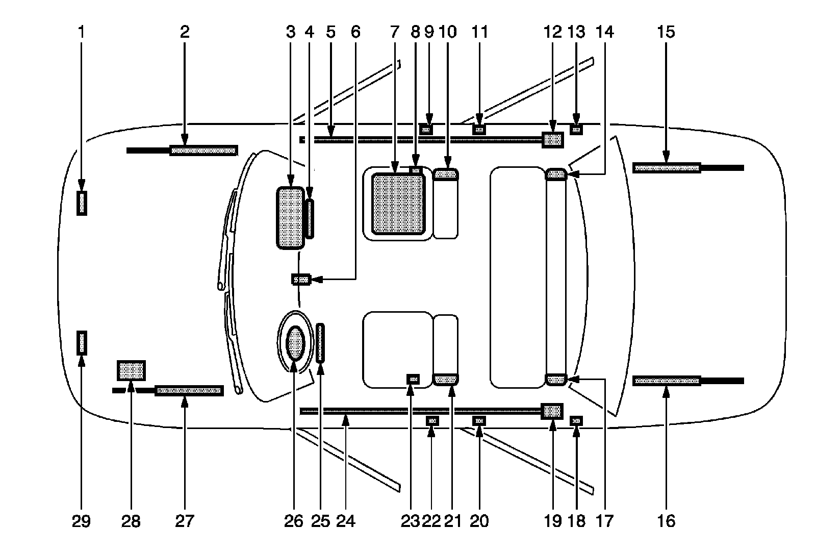 The SIR Identification Views shown below illustrate the approximate location of all SIR components available for the vehicle. This will assist in determining the appropriate SIR Disabling and Enabling for a given service procedure, refer to SIR Disabling and Enabling Service and Repair.