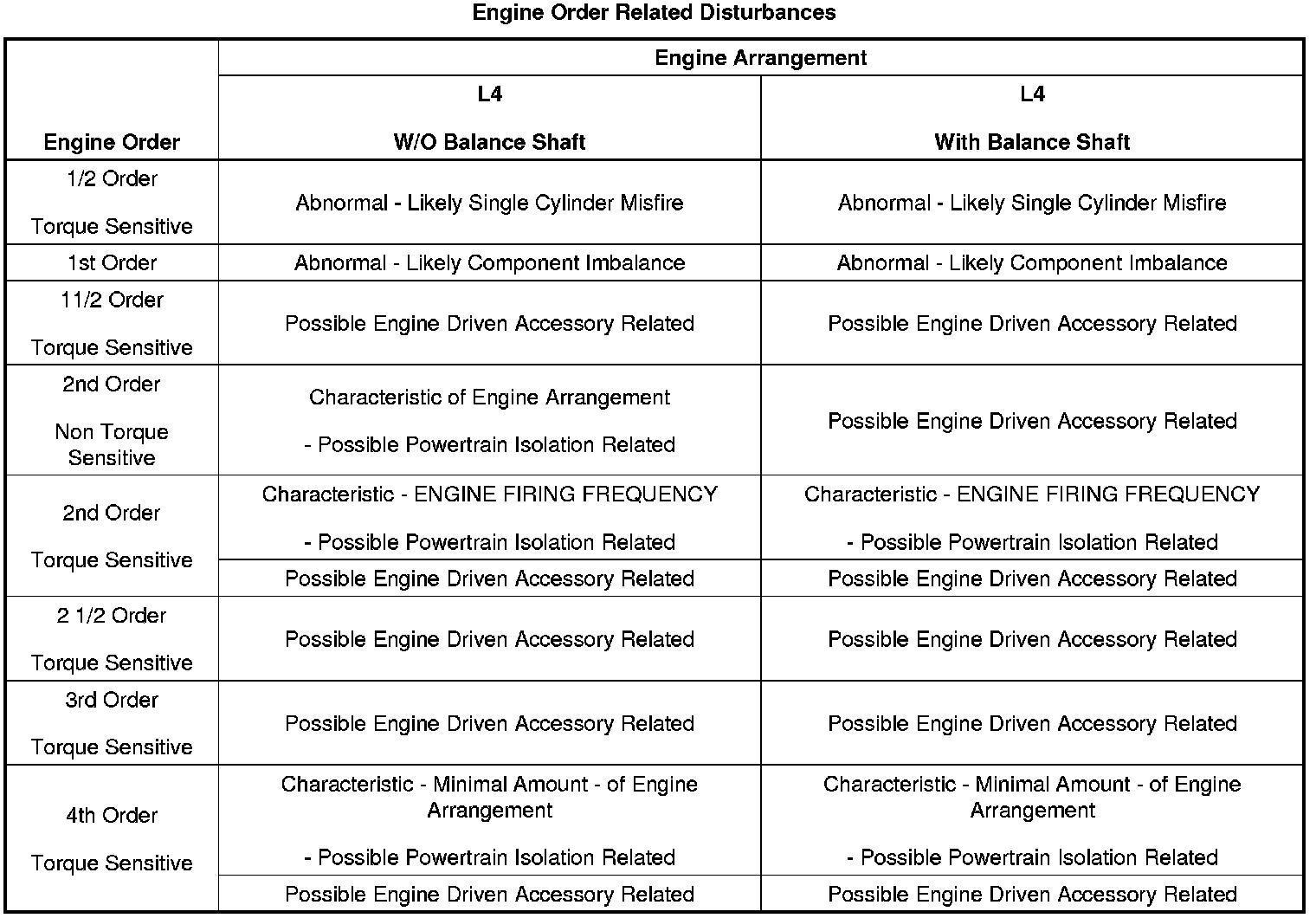 3. If the dominant frequency in Hz, recorded during duplication of the disturbance and the engine firing frequency in Hz, just calculated ARE related, then an engine FIRING FREQUENCY related disturbance is present. Engine firing frequency disturbances are usually related to improper isolation of a component. Refer to the Engine Order Related Disturbances table.