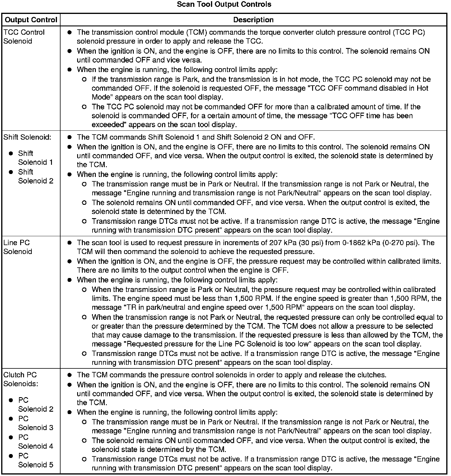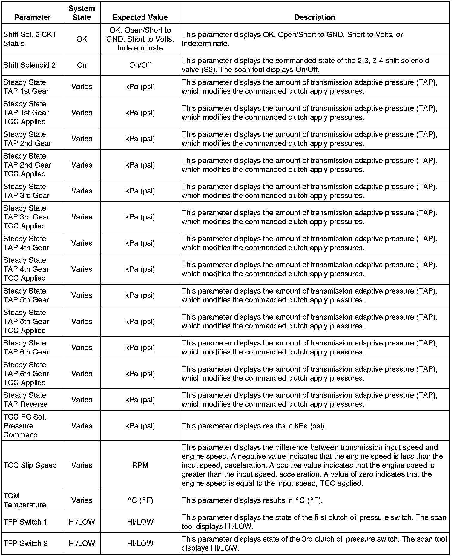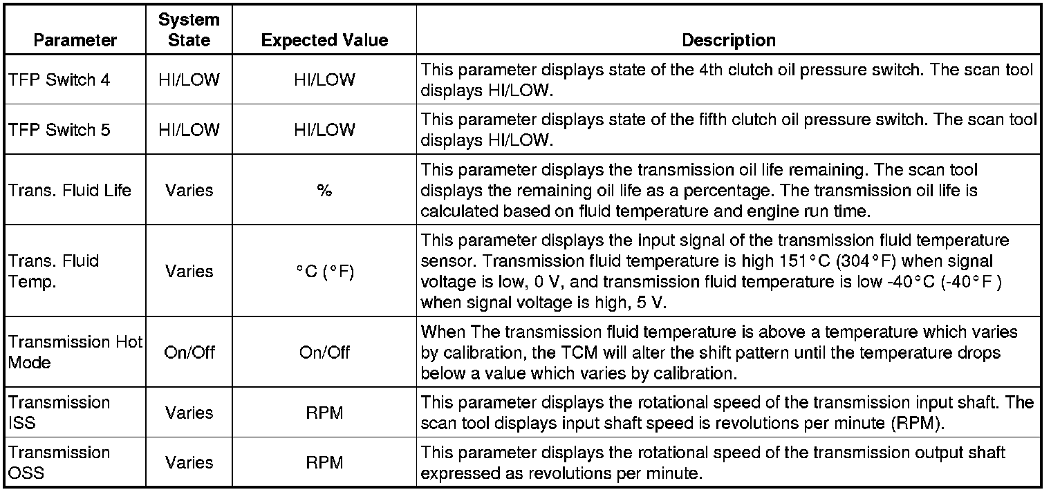 The Transmission Control Module Scan Tool Data List contains all transmission related parameters that are available on the scan tool. The list is arranged in alphabetical order. A given parameter may appear in any one of the data lists, and in some cases may appear more than once, or in more than one data list in order to group certain related parameters together.
