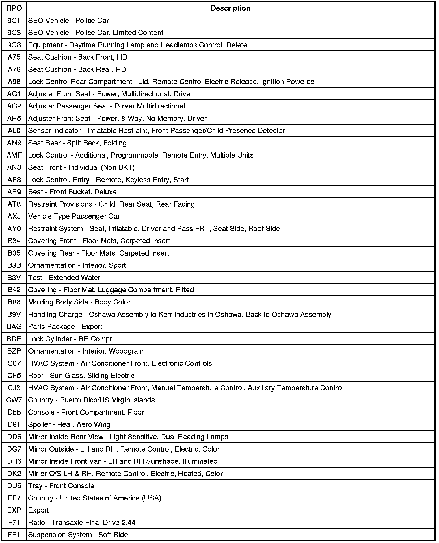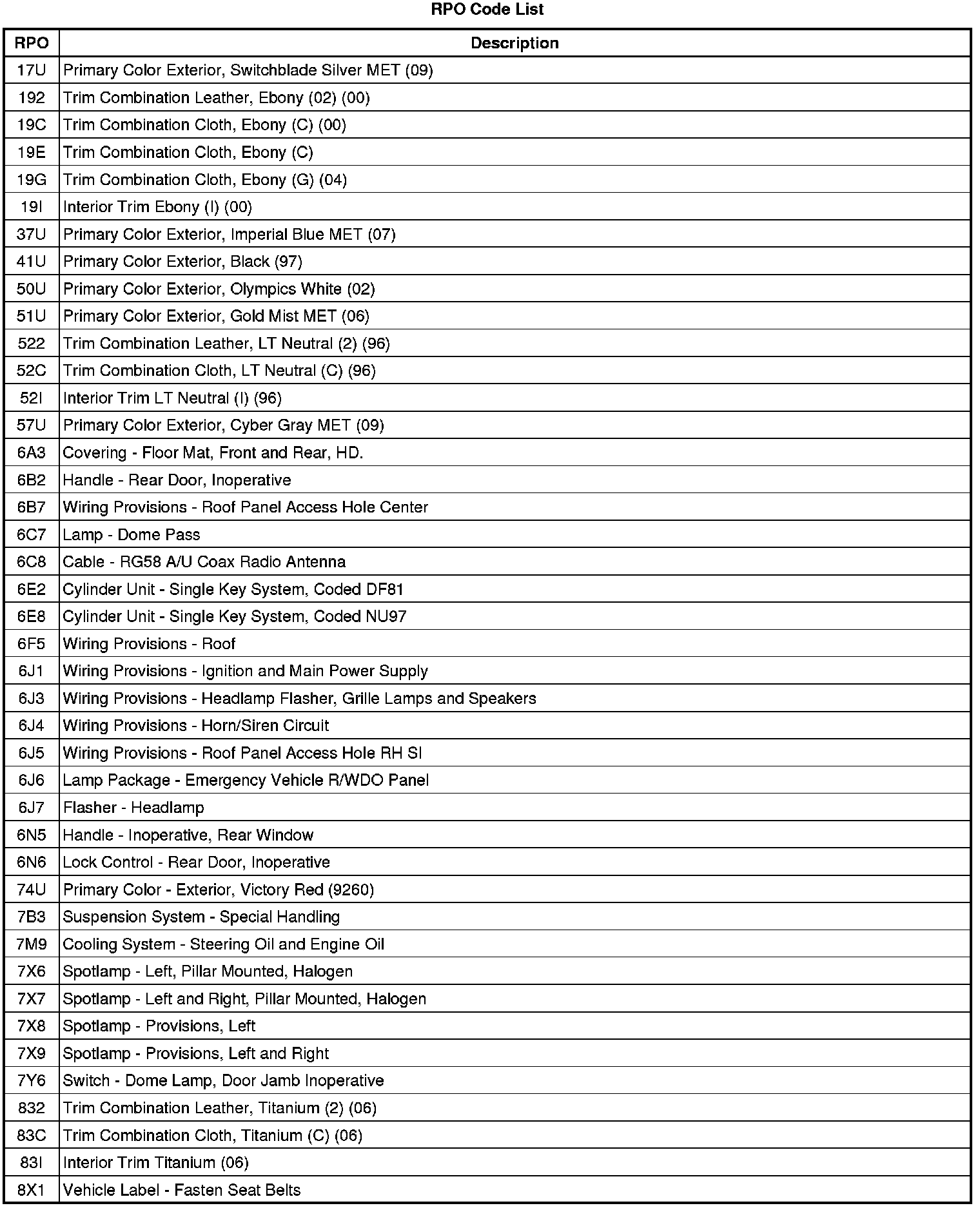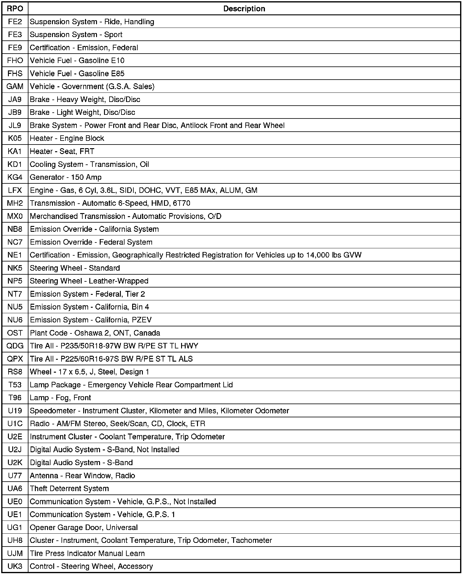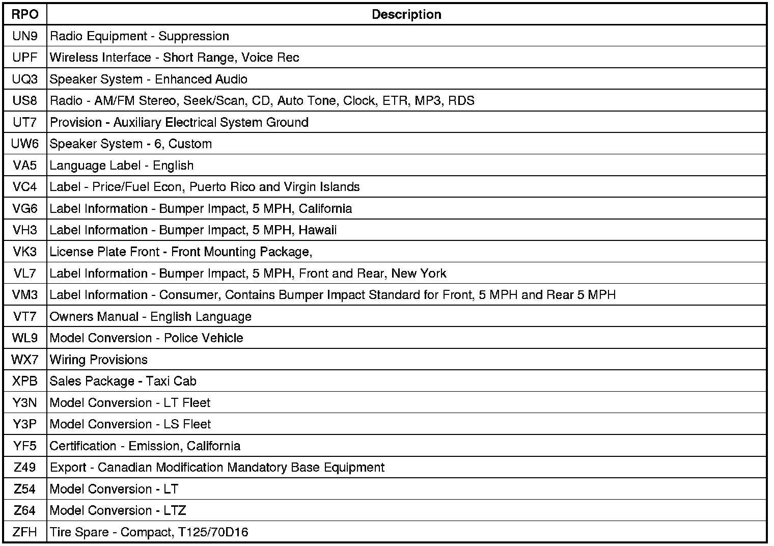 The following table provides the description of the Regular Production Option (RPO) codes that are available on the vehicle. The vehicle's RPO list is printed on the Service Parts Identification Label.
