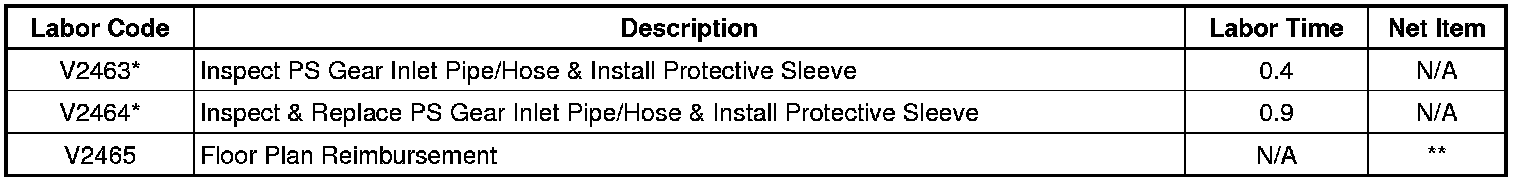 Dealers are to inspect to ensure that the upper power steering hose is routed correctly. If it is not, dealers are to replace the upper power steering hose. Dealers are to also install a protective sleeve around both power steering hoses on all vehicles (regardless of routing) to prevent abrasion of the power steering hoses.
