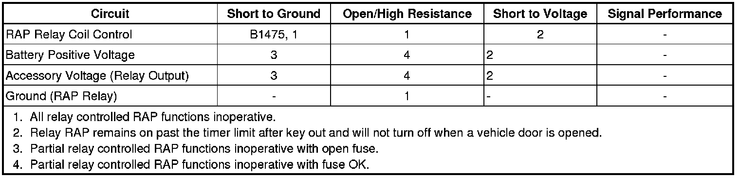 * A short to ground or open/high resistance in the RAP relay switched voltage circuits will cause only part of the RAP functions to be inoperative. Diagnose these symptoms within the respective system sections.