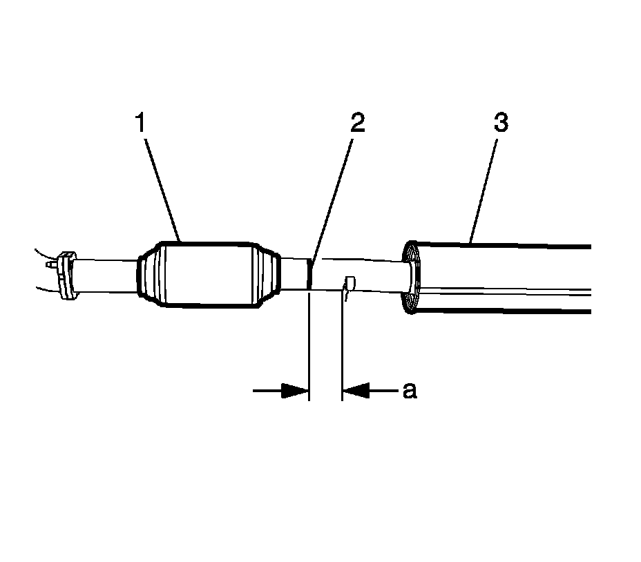 2. Cut the exhaust pipe (2) 64mm (2.5 inches) from the front exhaust muffler front hanger rods (a).