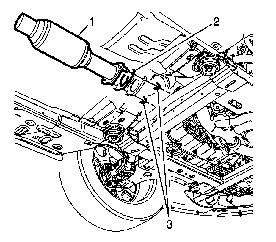 3. Remove the exhaust front pipe fasteners (3) from the catalytic converter (1) and discard the exhaust gasket (2).