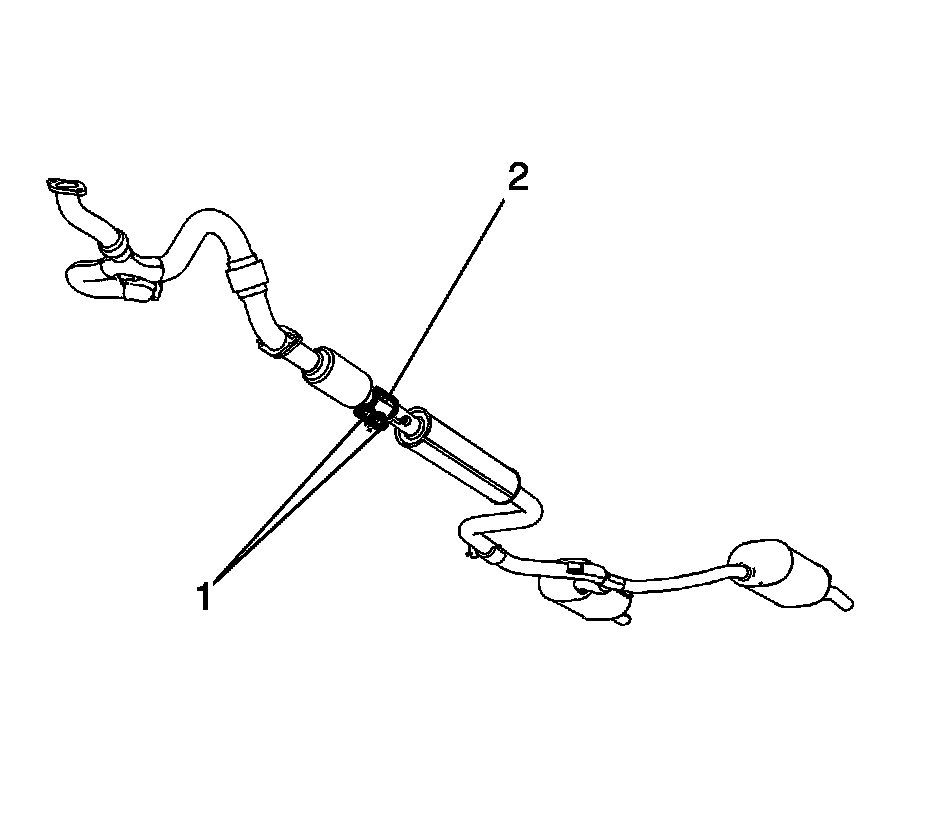 2. Install the exhaust service clamp (2) onto the exhaust muffler and the NEW catalytic converter. Tighten the exhaust clamp fasteners (1) to 50 Nm (37 lb ft).