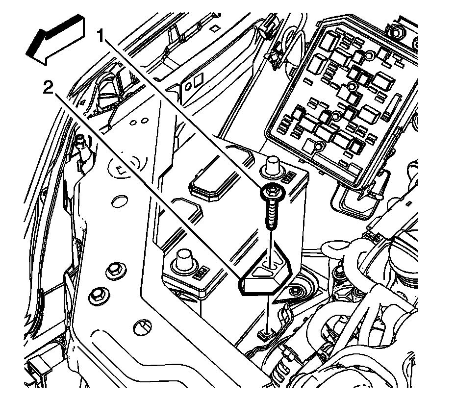 6. Remove the battery hold down fastener (1) and hold down retainer (2).