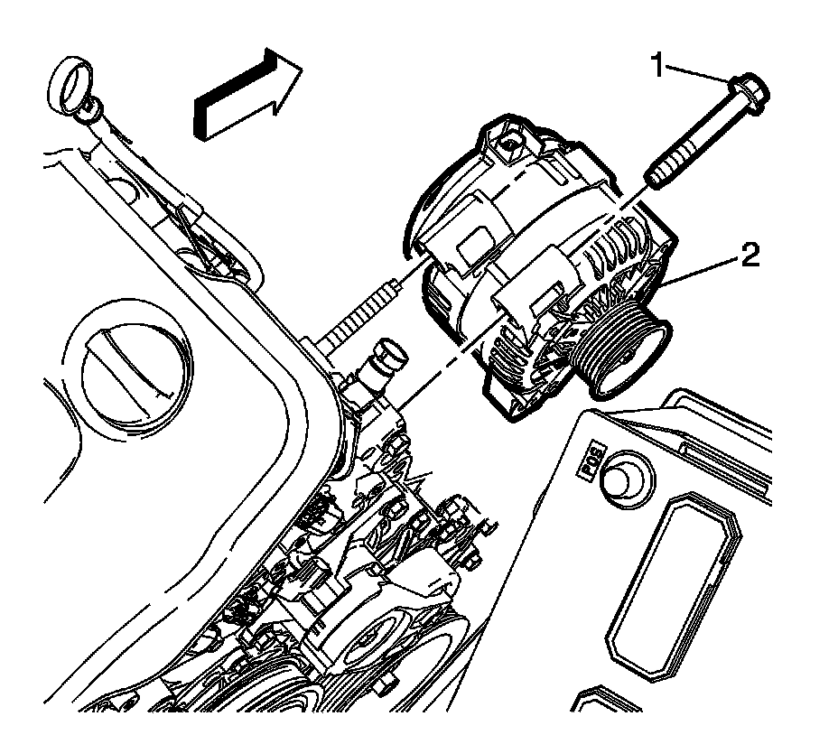 6. Remove the generator mounting fastener (1) and remove the generator (2).