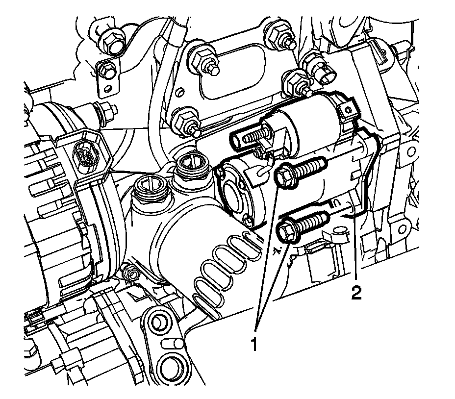 9. Install the starter heat shield (2) and tighten the starter heat shield fastener (1) to 5 Nm (44 lb in).
