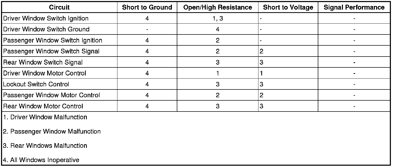 • If the passenger window functions from the driver window switch but not from the passenger window switch, refer to Passenger Window Switch Malfunction.