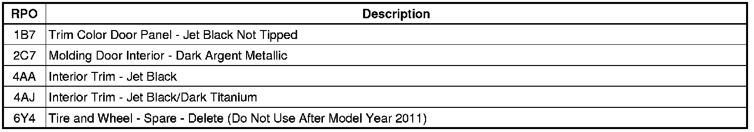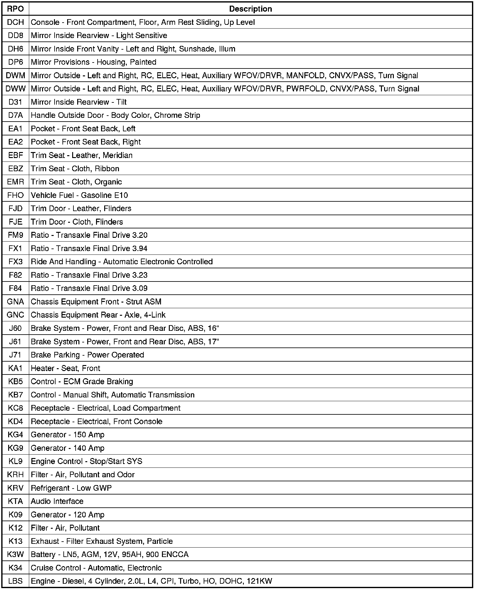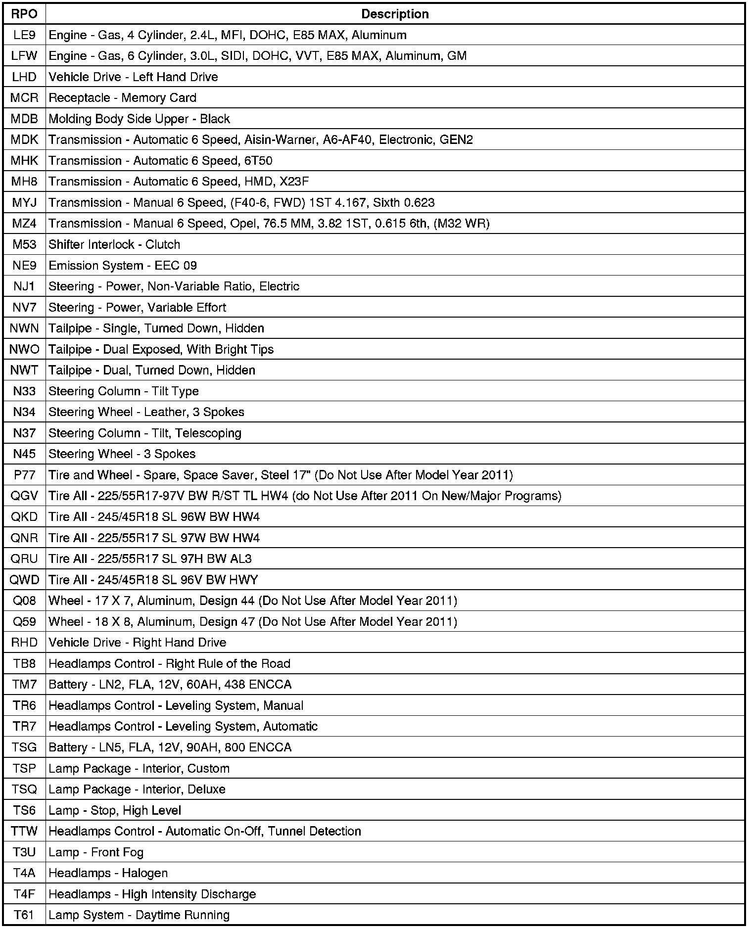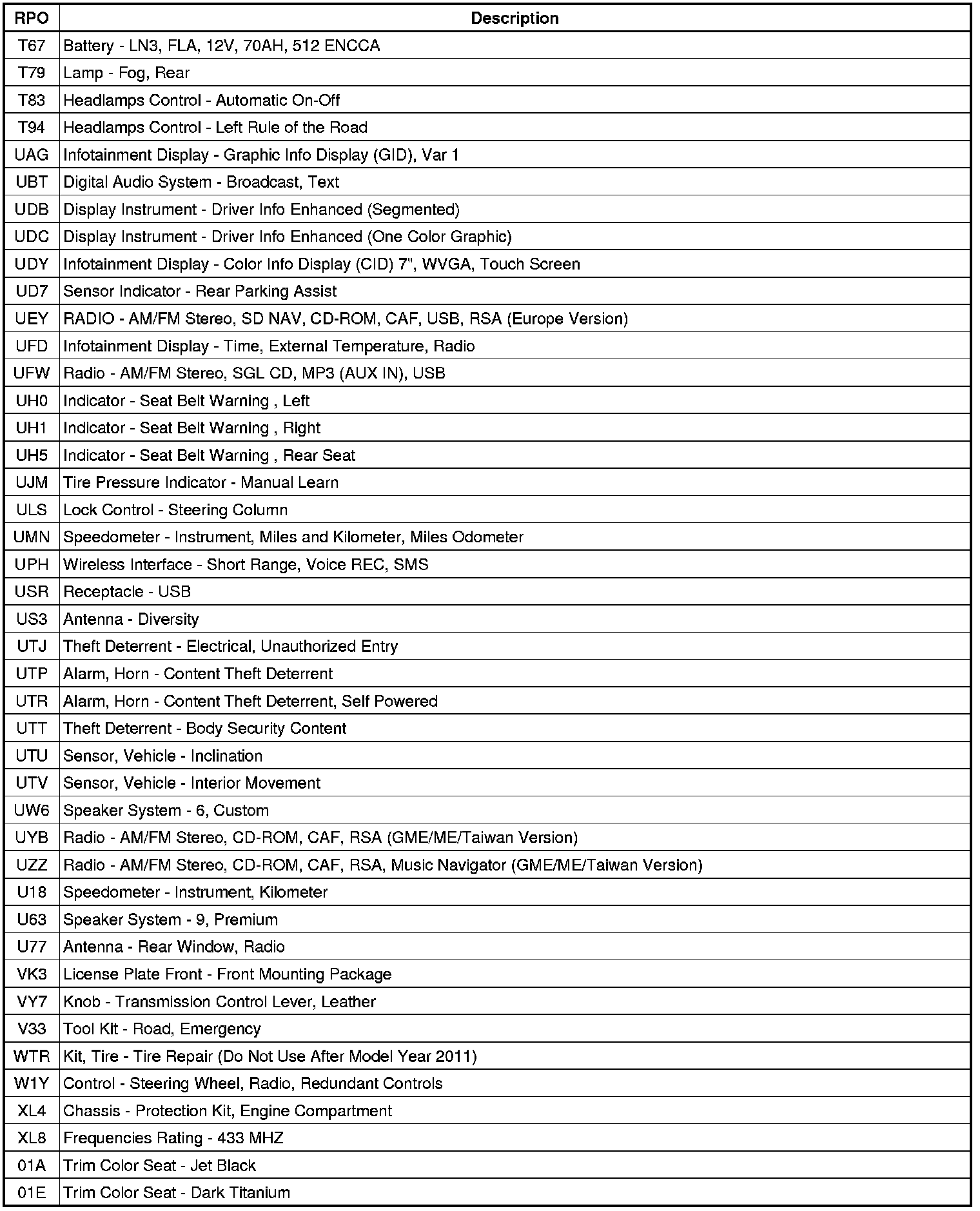 The following table provides the description of the Regular Production Option (RPO) codes that are available on the vehicle. The vehicle's RPO list is printed on the Service Parts Identification Label.