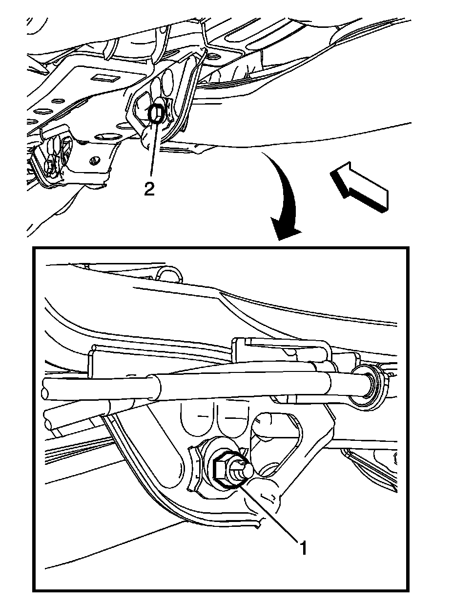 1. Remove the and discard the rear lower control arm bolt (2). DO NOT re-use. Replace with NEW only.
