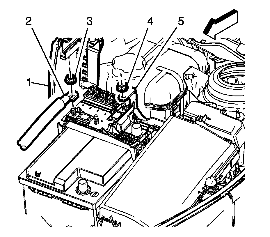 5. Remove the fastener (4) retaining the battery cable (5) from the front compartment fuse block. Disengage the cable.