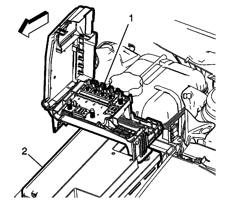 6. Disengage the tabs retaining the battery fuse block (1) to the battery (2). Remove the battery fuse block (1).
