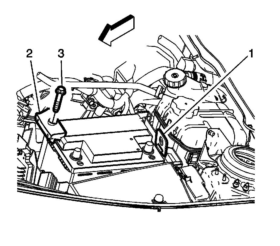 2. Install the forward battery (2) bracket and fastener (3) and tighten to 10 Nm (89 lb in).
