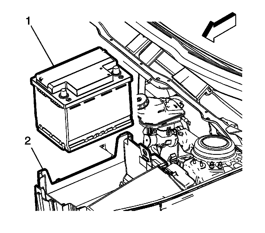 7. Loosen the rear battery hold down tray retainer fastener from the rear battery hold down (1).