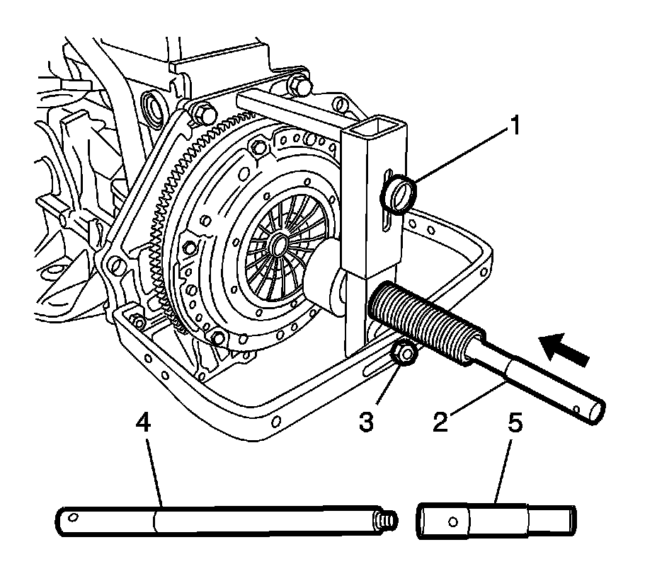 2. Insert centring drift with DT-6263-30 - remover and installer(2) through DT-6263 - remover and installerinto clutch plate and crankshaft (center).