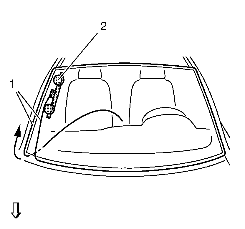 The cutting wire (1) should be rolled in beneath the rubber window seal (2) at the windscreen.