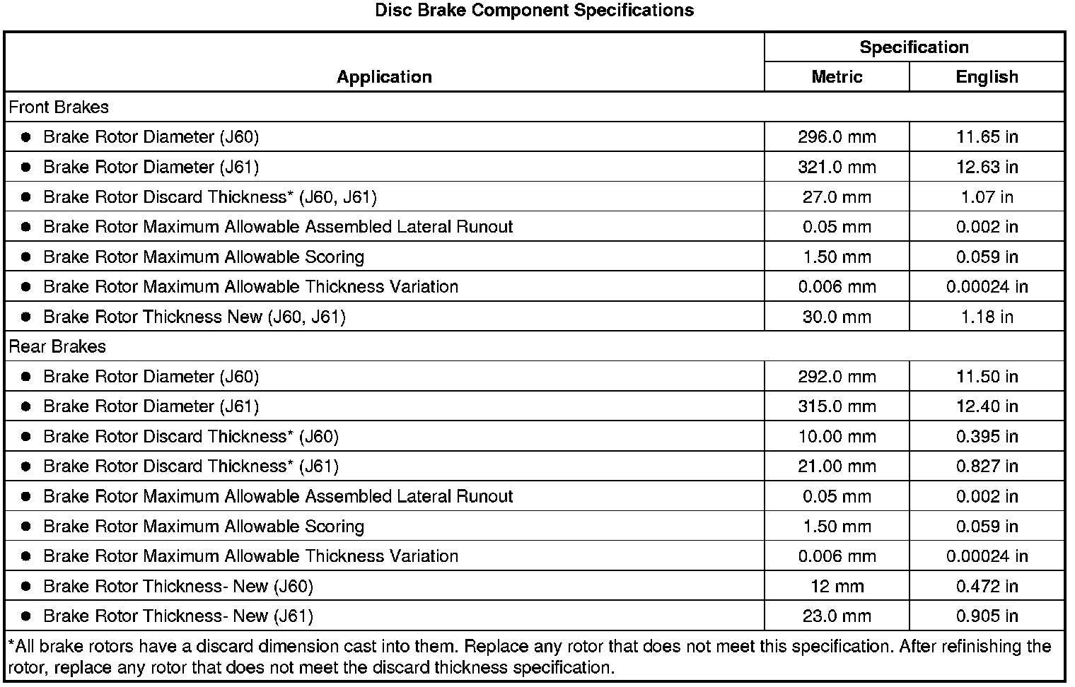 Disc Brake Component Specifications