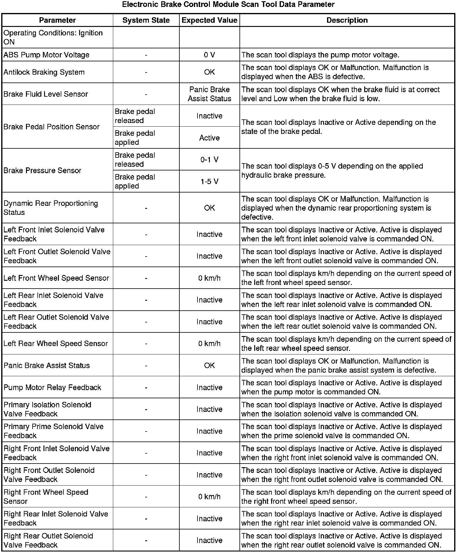 The electronic brake control module (EBCM) scan tool data parameters list contains all ABS related parameters that are available on the scan tool. The list is arranged in alphabetical order. A given parameter may appear in any one of the data lists.
