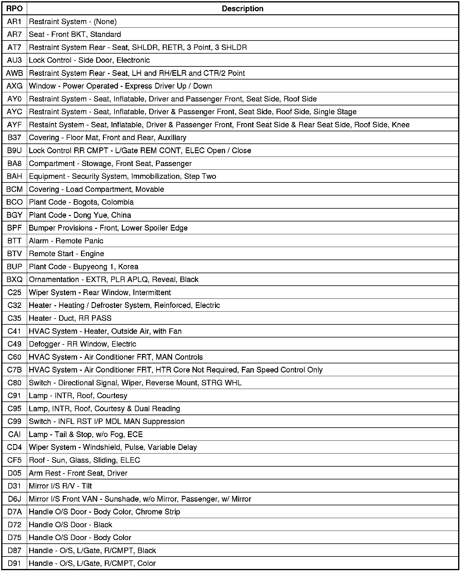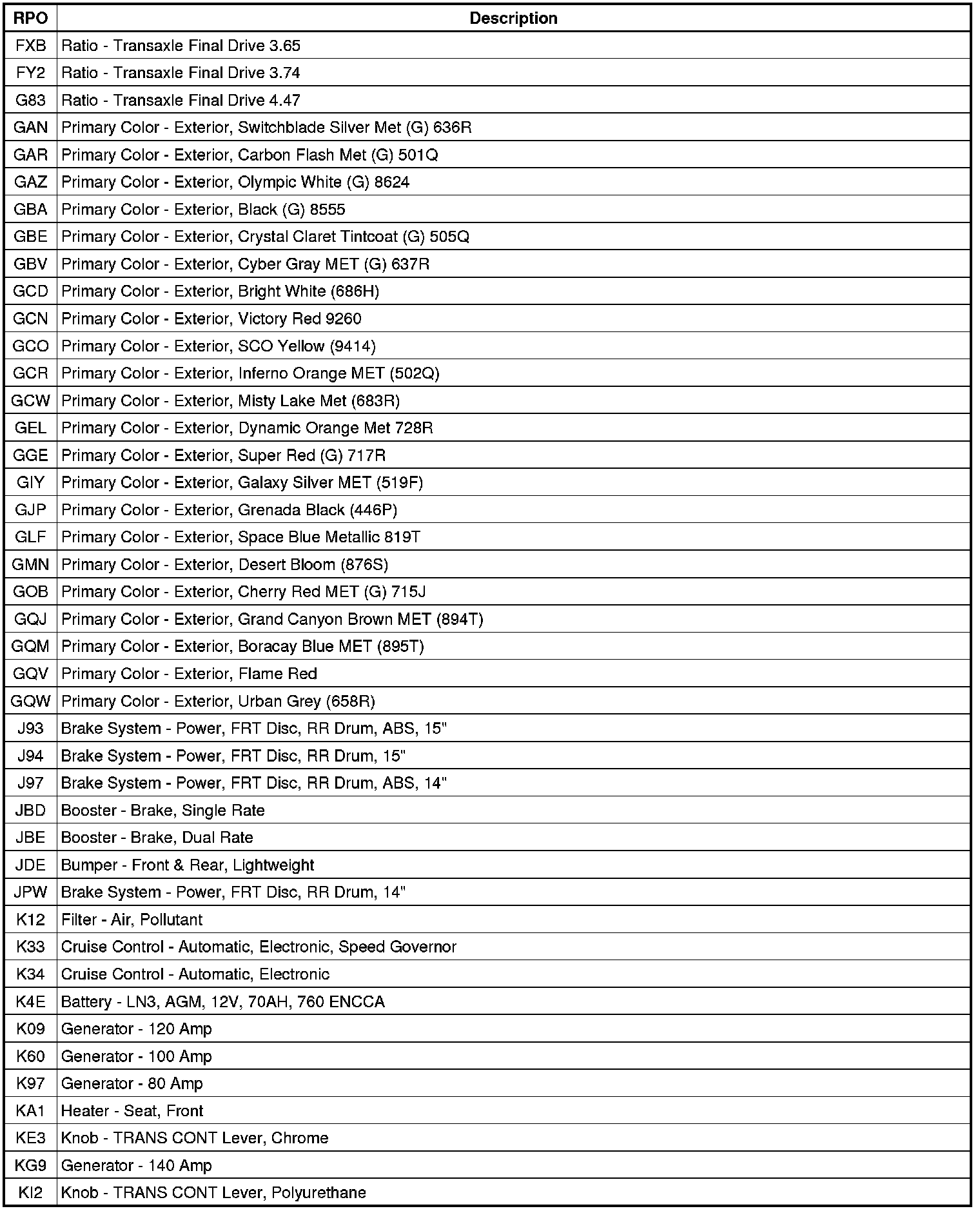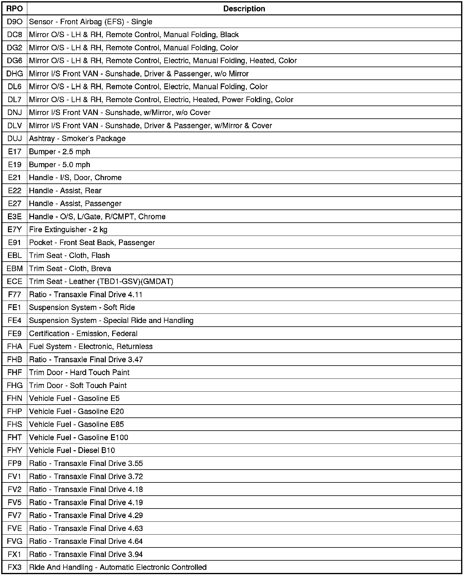 RPO Code List