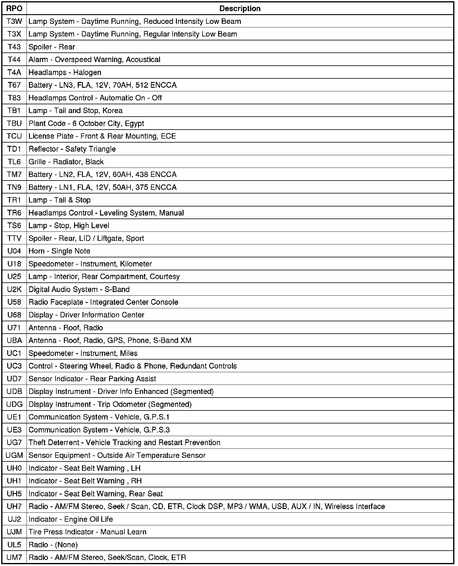 The following table provides the description of the Regular Production Option (RPO) codes that are available on the vehicle. The vehicle's RPO list is printed on the Service Parts Identification Label.